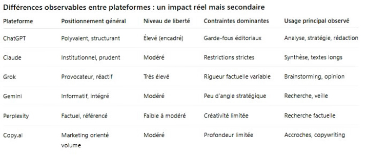 Ces différences influencent le style, la posture et certains usages spécifiques. Elles expliquent des préférences. Elles n’expliquent pas les écarts de qualité substantiels observés dans les productions finales. À pratiques comparables, les résultats convergent. À pratiques inégales, les écarts se creusent, indépendamment de la plateforme choisie.